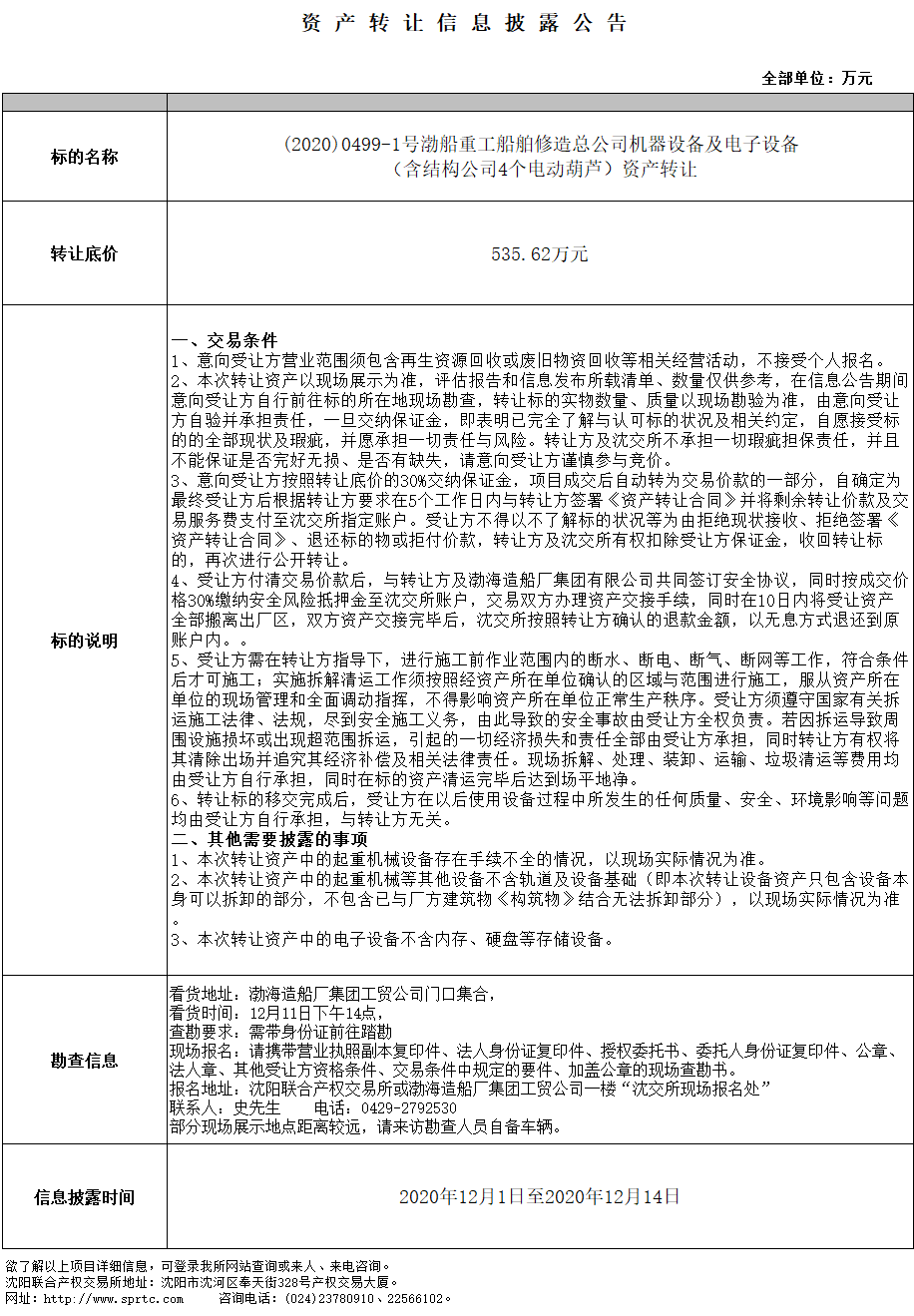 渤船重工船舶修造總公司機(jī)器設(shè)備及電子設(shè)備(含結(jié)構(gòu)4個(gè)電動(dòng)葫蘆)轉(zhuǎn)讓