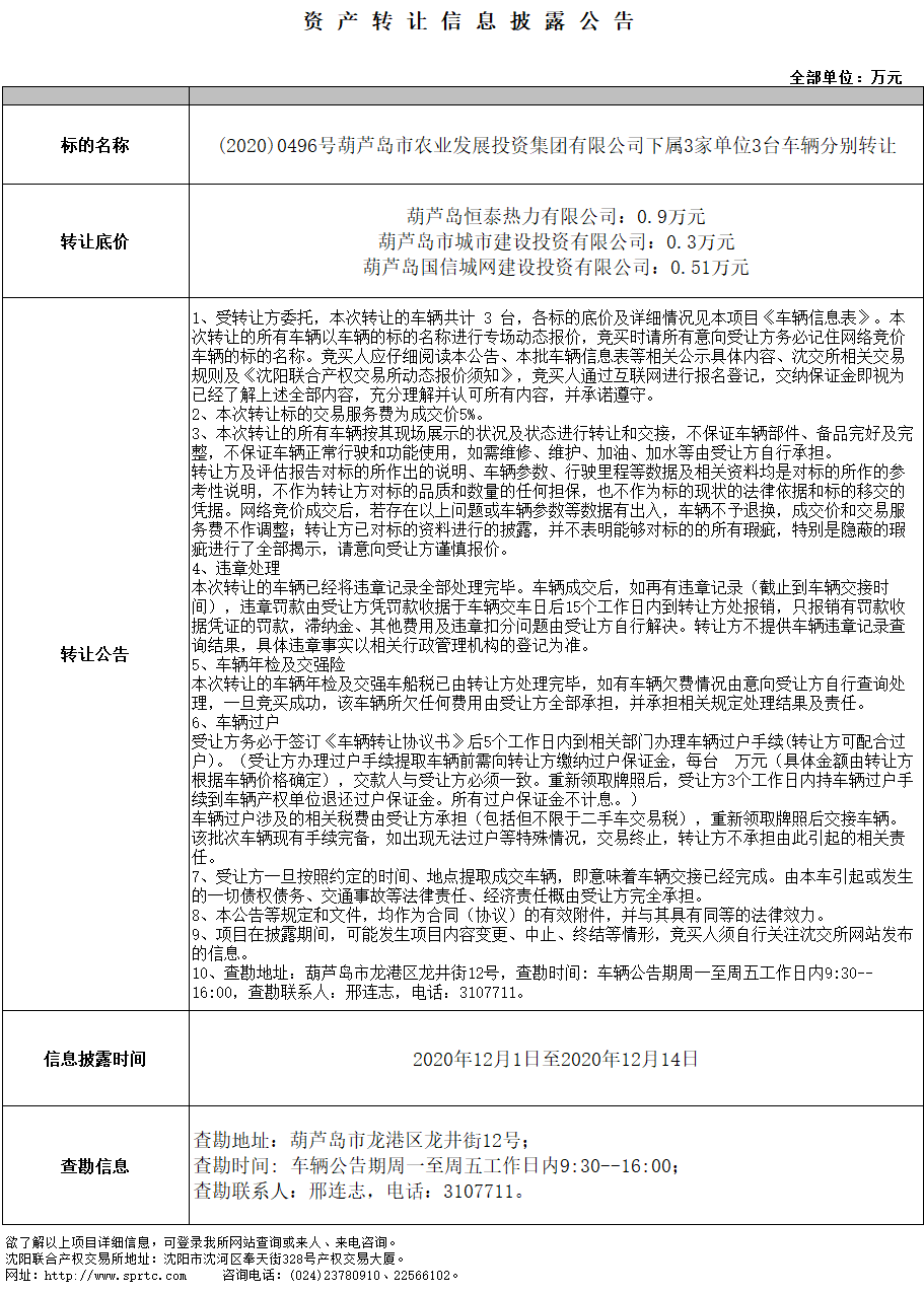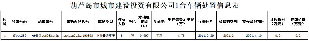 葫蘆島市城市建設投資有限公司一臺車輛轉(zhuǎn)讓