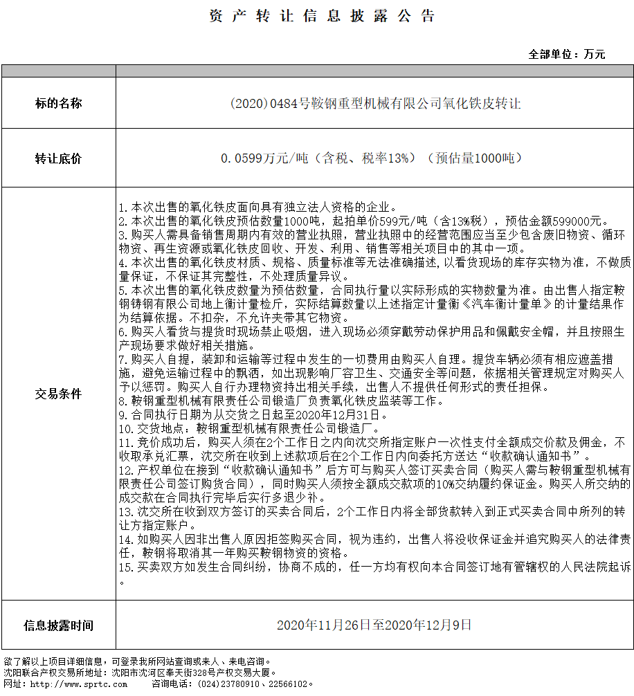 鞍鋼重型機(jī)械有限責(zé)任公司氧化鐵皮轉(zhuǎn)讓