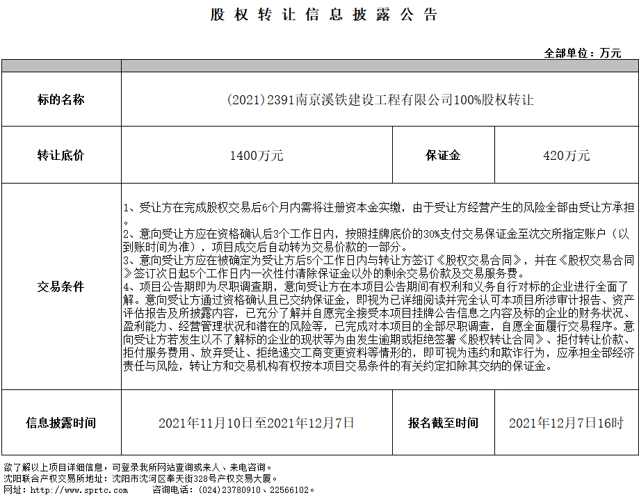 (2021)2391南京溪鐵建設(shè)工程有限公司100%股權(quán)轉(zhuǎn)讓