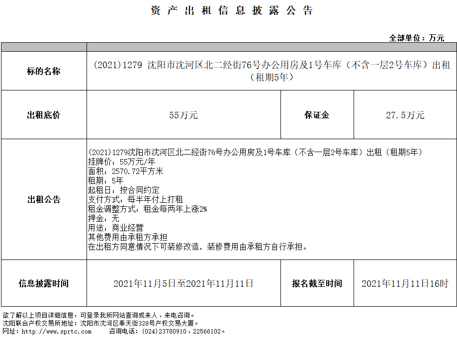 (2021)1279 沈陽(yáng)市沈河區(qū)北二經(jīng)街76號(hào)辦公用房及1號(hào)車(chē)庫(kù)(不含一層2號(hào)車(chē)庫(kù))出租(租期5年)