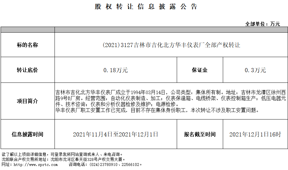 吉林市吉化北方華豐儀表廠整體產(chǎn)權(quán)