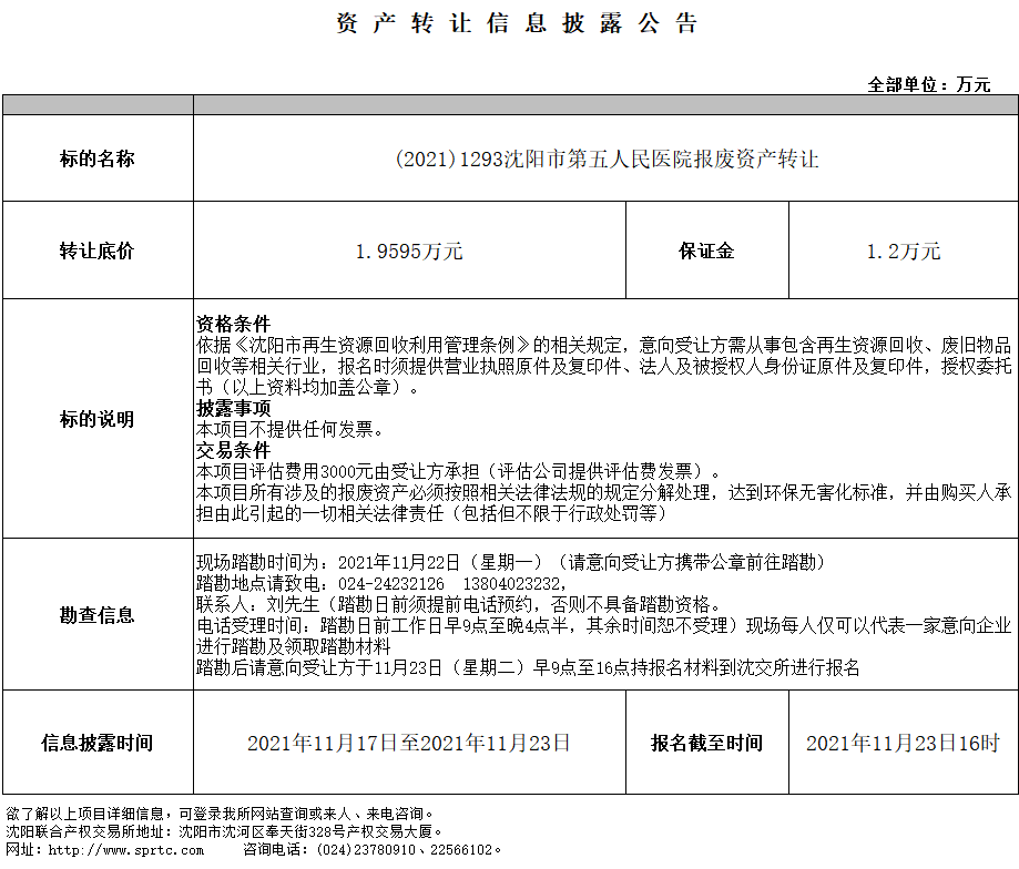 (2021)1293沈陽市第五人民醫(yī)院報廢資產轉讓