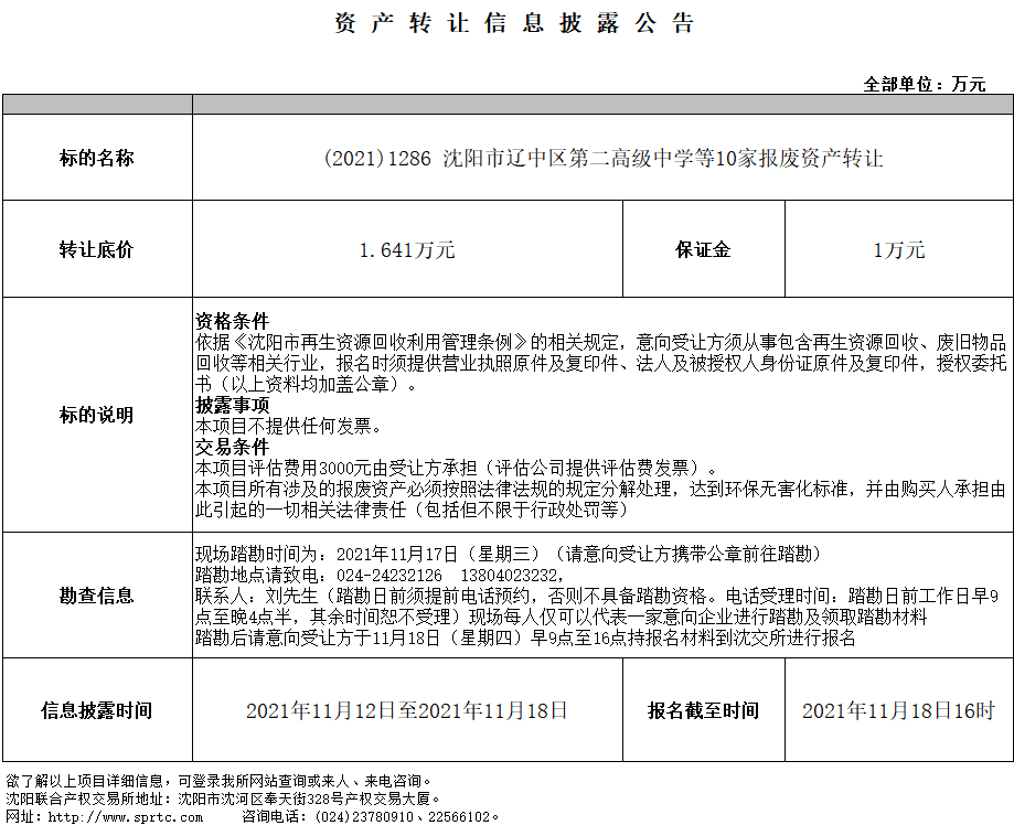 (2021)1286 沈陽市遼中區(qū)第二高級中學(xué)等10家報廢資產(chǎn)轉(zhuǎn)讓