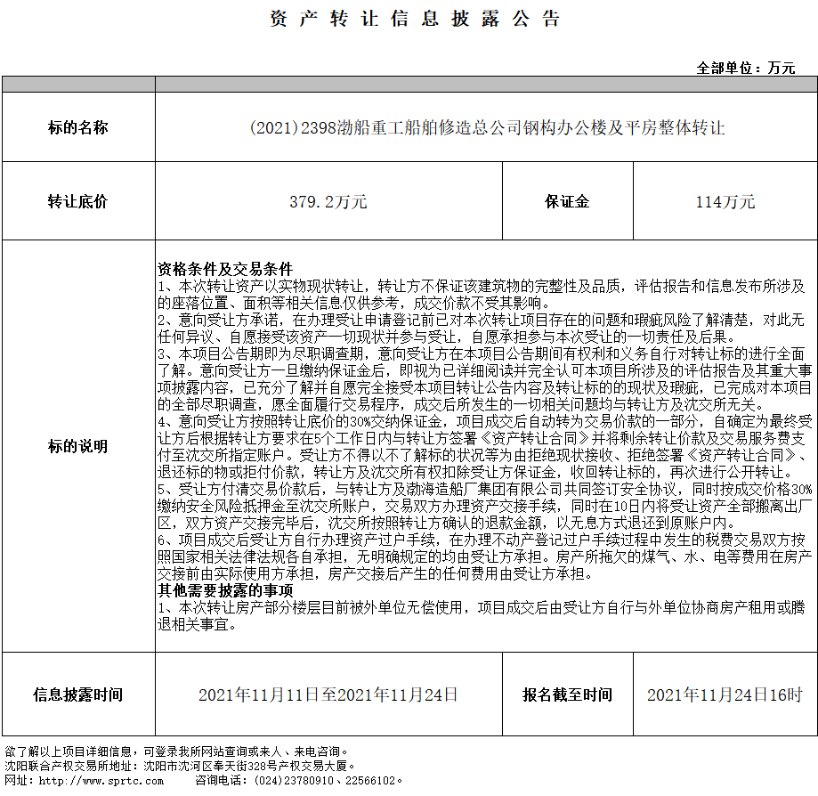 (2021)2398渤船重工船舶修造總公司鋼構(gòu)辦公樓及平房整體轉(zhuǎn)讓