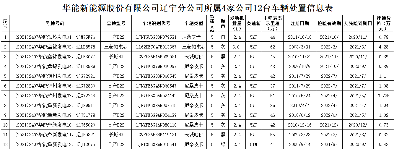 (2021)2407華能新能源股份有限公司遼寧分公司所屬4家公司12臺(tái)車輛分別轉(zhuǎn)讓