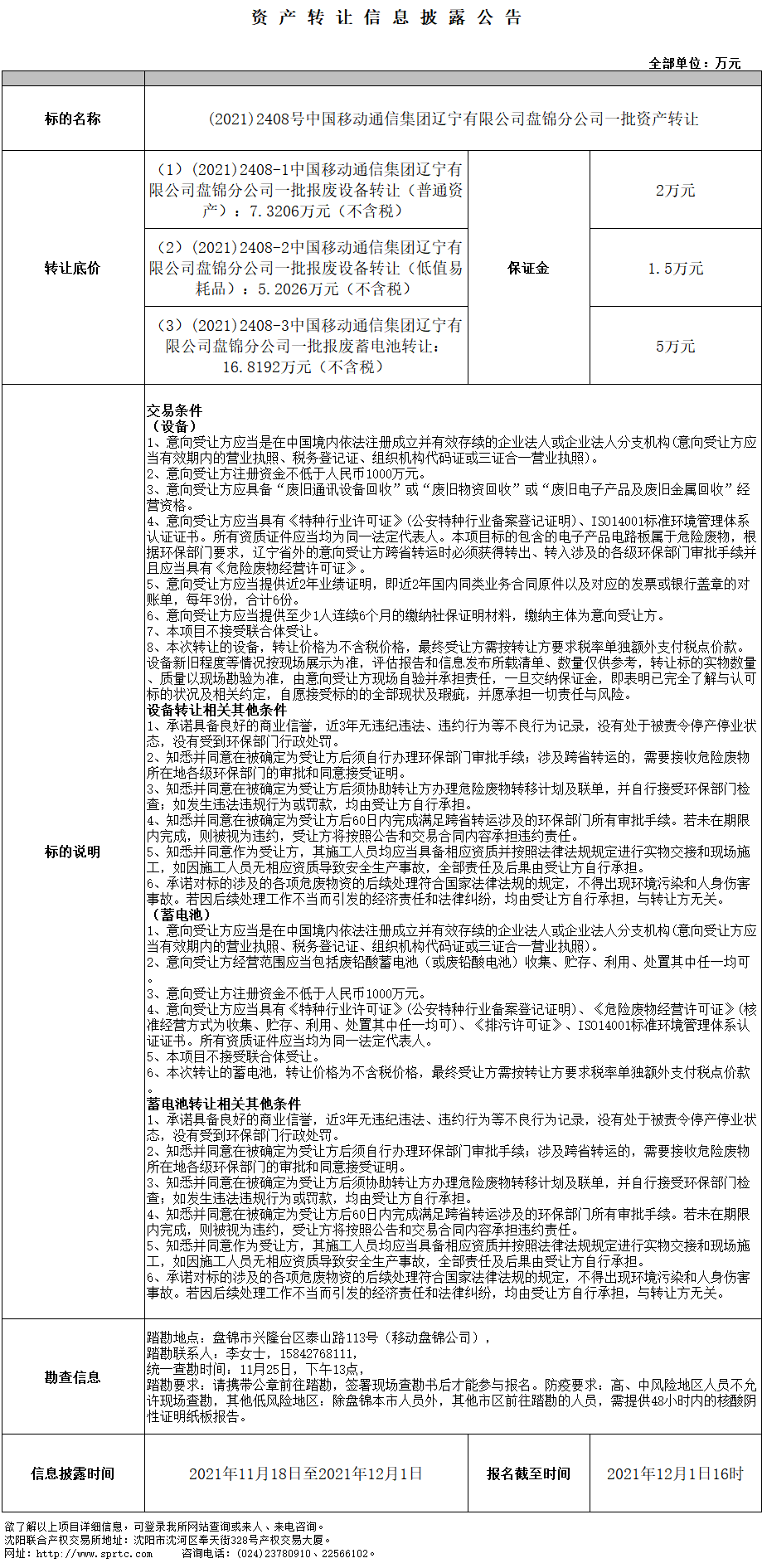 (2021)2408-1中國(guó)移動(dòng)通信集團(tuán)遼寧有限公司盤錦分公司一批報(bào)廢設(shè)備轉(zhuǎn)讓(普通資產(chǎn))