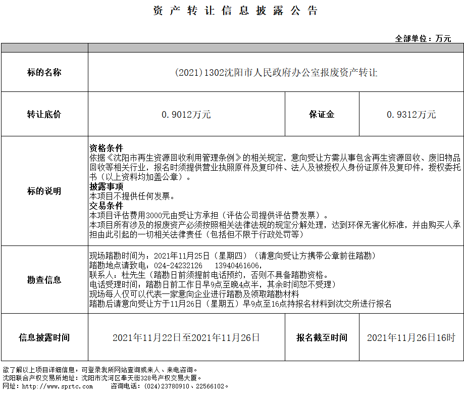 (2021)1302沈陽市人民政府辦公室報(bào)廢資產(chǎn)轉(zhuǎn)讓