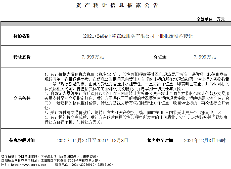 (2021)2404中移在線服務(wù)有限公司一批報(bào)廢設(shè)備轉(zhuǎn)讓