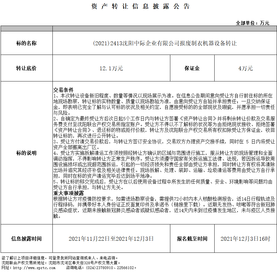 (2021)2413沈陽中際企業(yè)有限公司報(bào)廢制衣機(jī)器設(shè)備轉(zhuǎn)讓