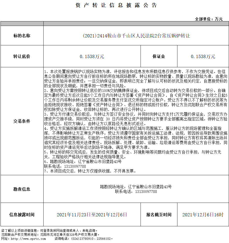 (2021)2414鞍山市千山區(qū)人民法院2臺常壓鍋爐轉(zhuǎn)讓