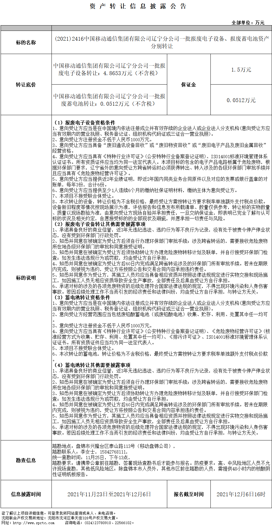 (2021)2416-2中國移動通信集團有限公司遼寧分公司一批報廢蓄電池轉讓