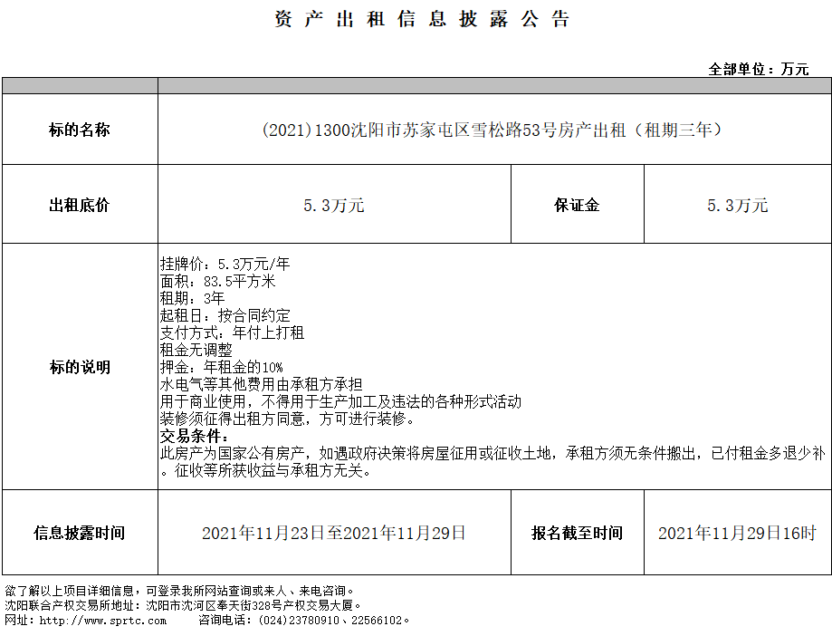 (2021)1300沈陽市蘇家屯區(qū)雪松路53號房產(chǎn)出租(租期三年)