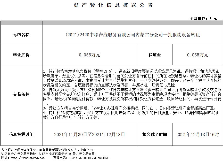 (2021)2420中移在線服務有限公司內(nèi)蒙古分公司一批報廢設備轉(zhuǎn)讓