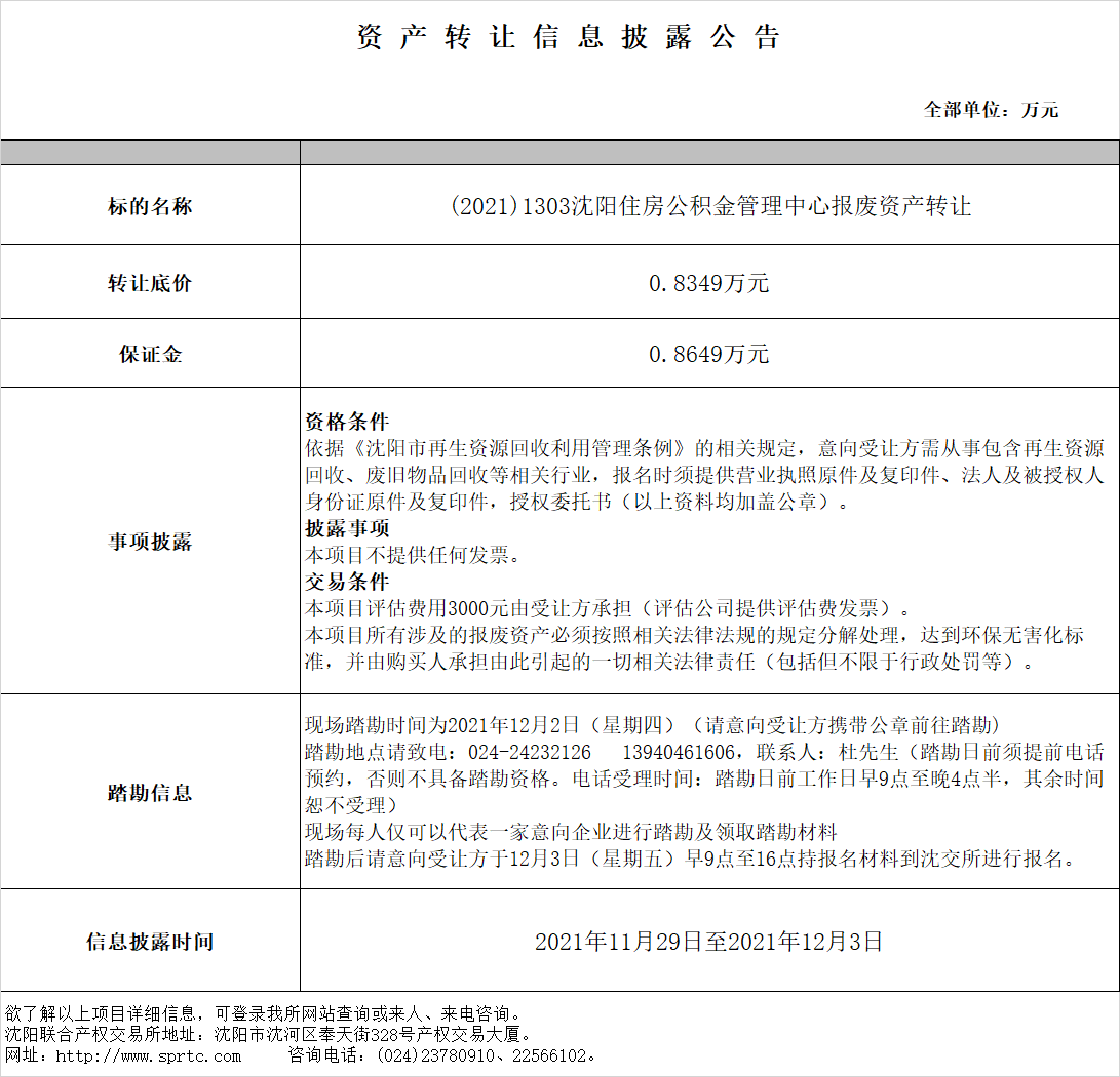(2021)1303沈陽住房公積金管理中心報廢資產(chǎn)轉(zhuǎn)讓。