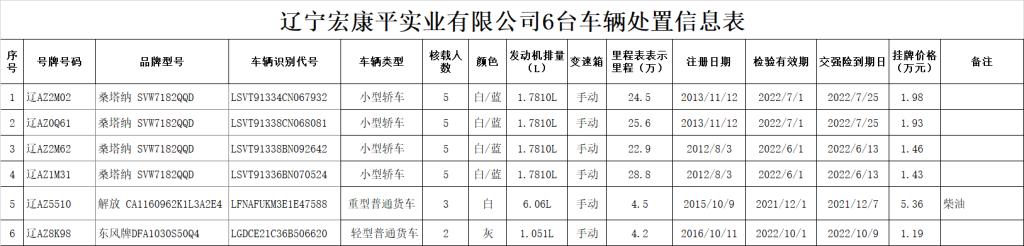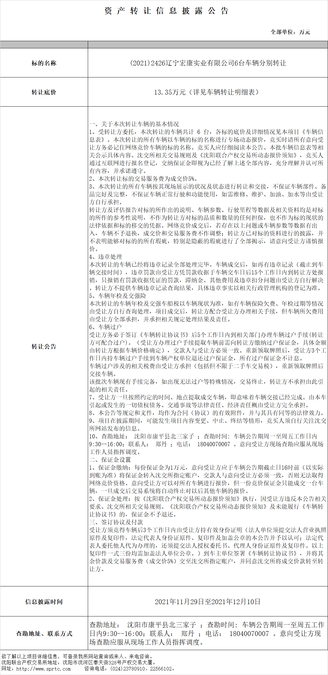 (2021)2426遼寧宏康實(shí)業(yè)有限公司6臺車輛分別轉(zhuǎn)讓