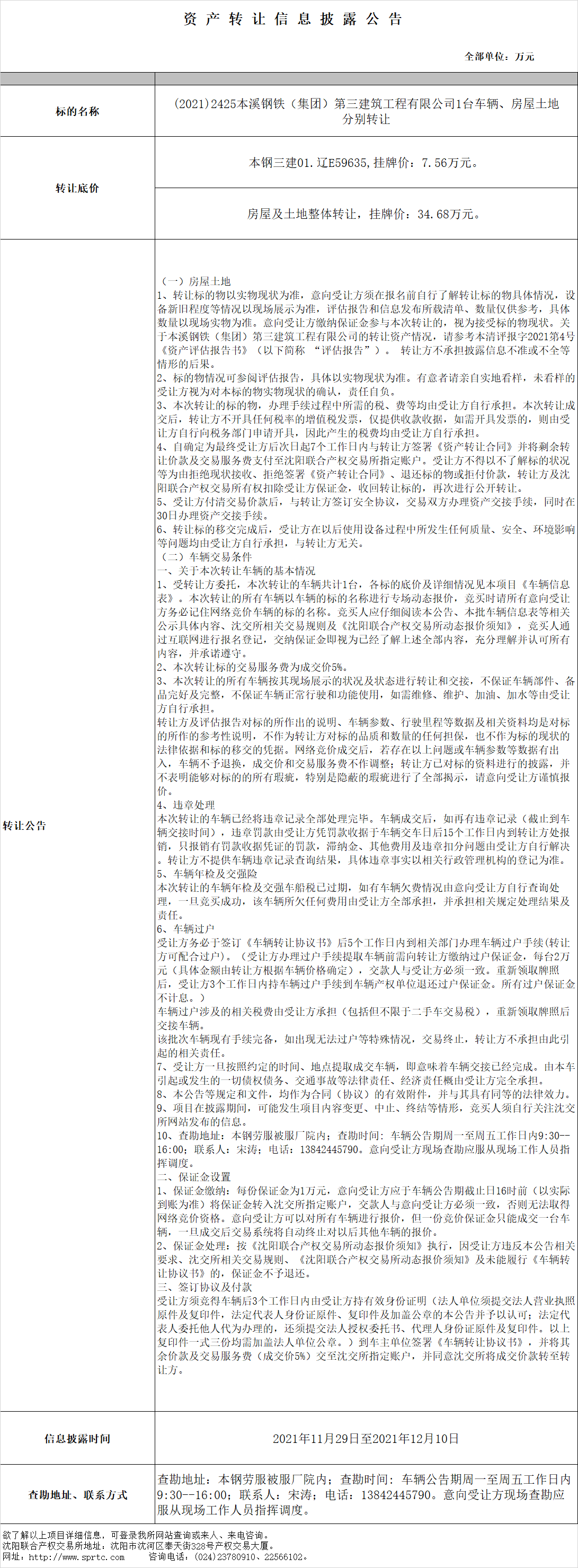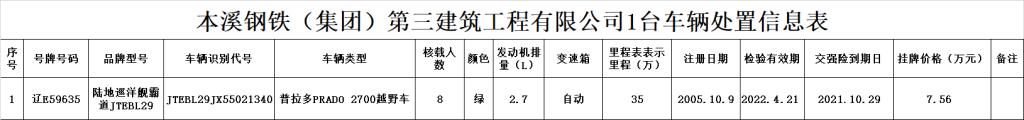 本溪鋼鐵(集團)第三建筑工程有限公司1臺車輛轉(zhuǎn)讓。