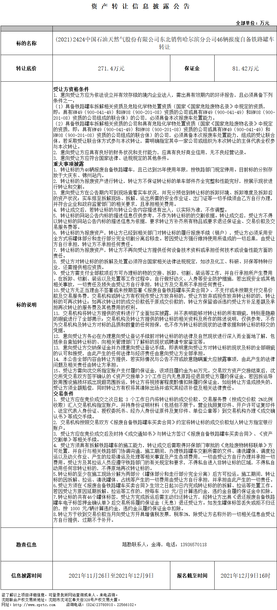 (2021)2424中國石油天然氣股份有限公司東北銷售哈爾濱分公司46輛報廢自備鐵路罐車轉(zhuǎn)讓