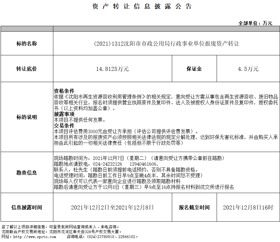 (2021)1312沈陽(yáng)市市政公用局報(bào)廢資產(chǎn)轉(zhuǎn)讓