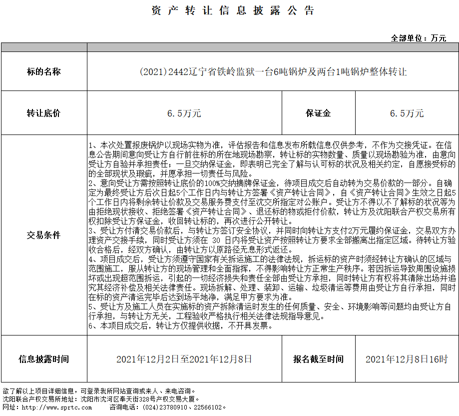 (2021)2442遼寧省鐵嶺監(jiān)獄一臺6噸鍋爐及兩臺1噸鍋爐整體轉讓
