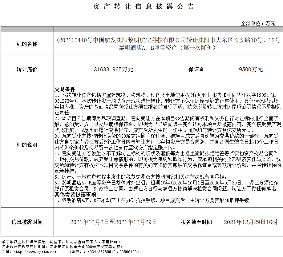 (2021)2440沈陽(yáng)市大東區(qū)長(zhǎng)安路10號(hào)、12號(hào)黎明酒店A、B座等資產(chǎn)轉(zhuǎn)讓?zhuān)ǖ谝淮谓祪r(jià))