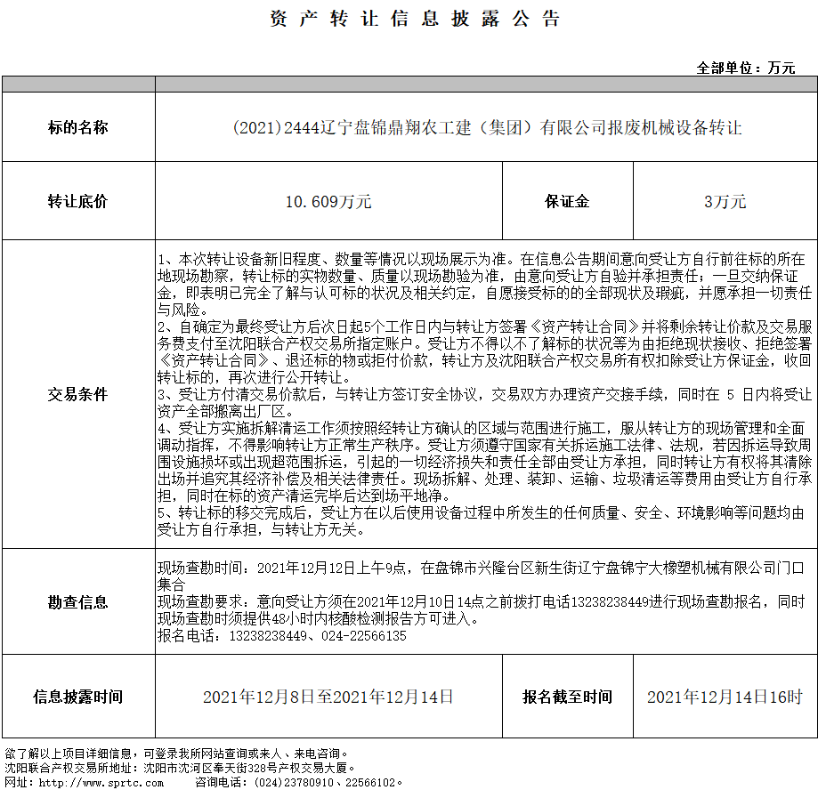 (2021)2444遼寧盤錦鼎翔農(nóng)工建(集團(tuán))有限公司報(bào)廢機(jī)械設(shè)備轉(zhuǎn)讓