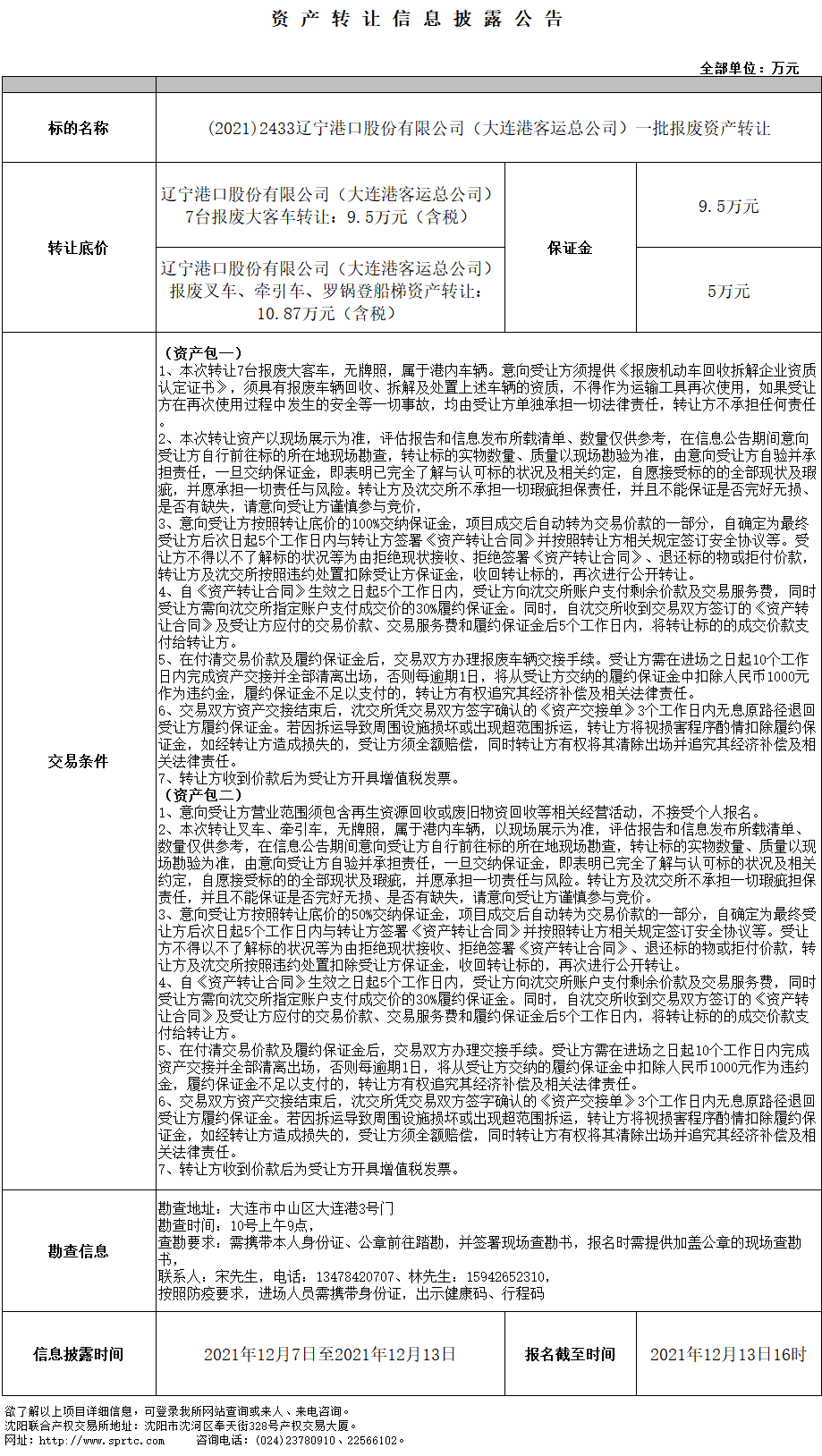 (2021)2433-2遼寧港口股份有限公司(大連港客運總公司)報廢叉車、牽引車、羅鍋登船梯資產(chǎn)轉(zhuǎn)讓