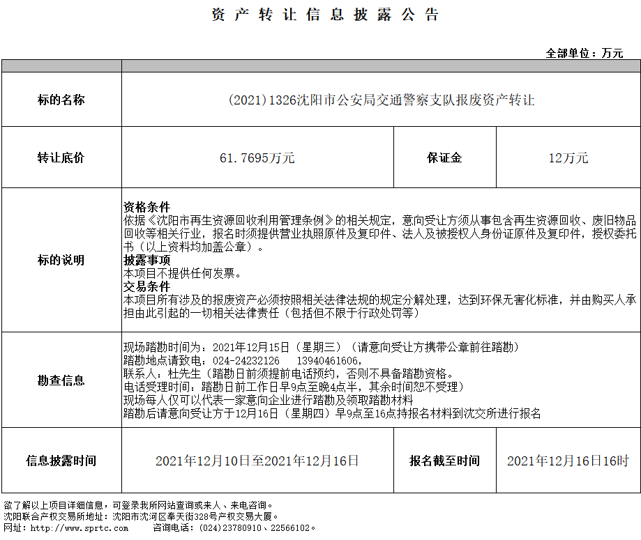 (2021)1326沈陽(yáng)市公安局交通警察支隊(duì)報(bào)廢資產(chǎn)轉(zhuǎn)讓