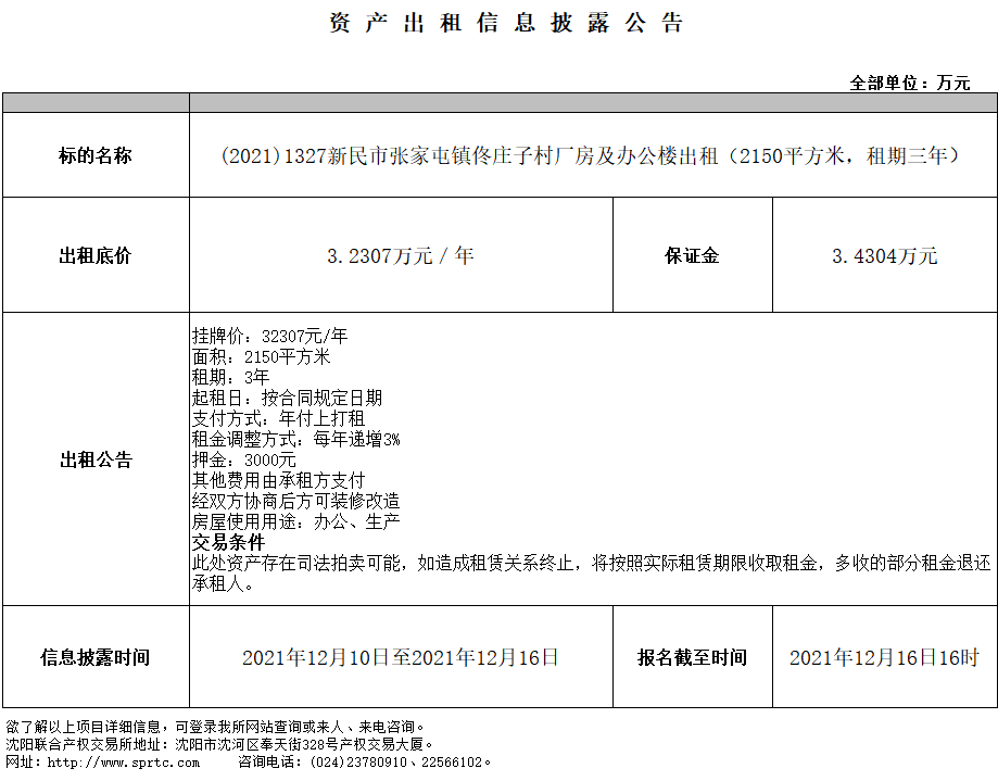 (2021)1327新民市張家屯鎮(zhèn)佟莊子村廠房及辦公樓出租(2150平方米 租期三年)