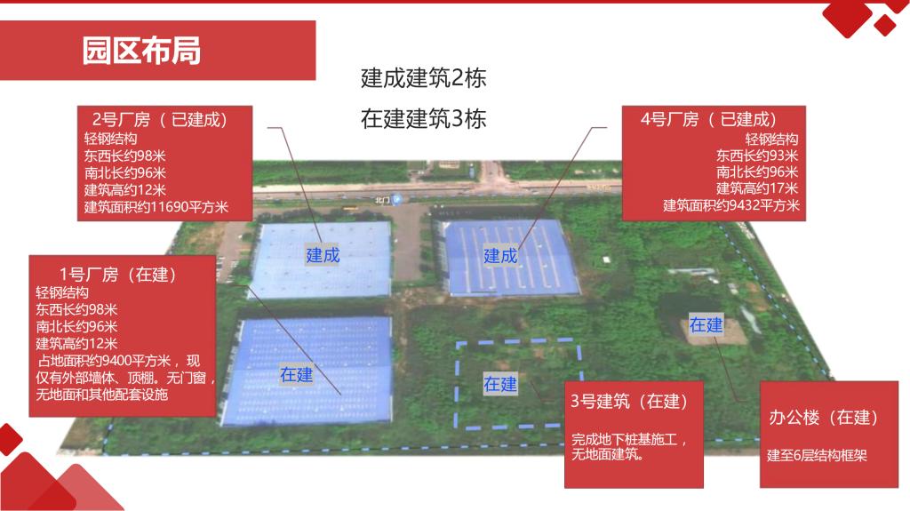 該處項(xiàng)目占地面積178.24畝,工業(yè)出讓用地,使用期至2056年;該項(xiàng)目南北長(zhǎng)280米、東西長(zhǎng)420米。現(xiàn)有建成廠房2棟、在建廠房1棟、在建辦公樓1棟(6層框架結(jié)構(gòu))及1棟在建建筑(已完成地下樁基施工)。(詳見(jiàn)附件)